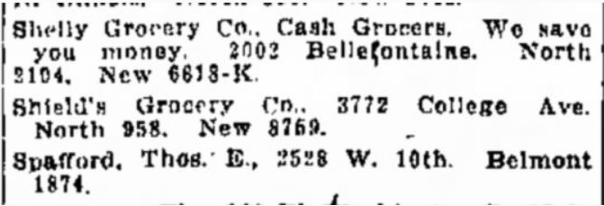 The Shields Grocery operated at 3772 N. College (Indianapolis Star directory page, 1914, below right) for several years, before the location was taken over by another grocery, the Maple Road Grocery. Even that was short lived as that business was advertised for sale in 1924 (Indianapolis Star advertisement, below left). Various other grocers and other businesses have occupied that address since then.
