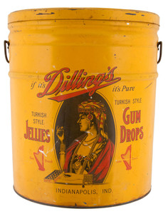 Today, one of the few things still around from the Dilling Candy Company are artifacts left over from the products themselves, including various tins and other containers which once held the candy. These often appear on eBay and other auction sites. Occasionally, documents from the company also appear. The images below are an example of a tin which appeared on a Hake’s Auction site earlier in July.
