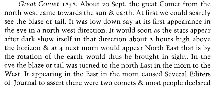 Fletcher’s first observation appears to have been in the latter half of September of 1858. The diary entry below, titled “Great Comet of 1858,” does not have a date, but provides a detailed description of the comet as Fletcher observed it from Indianapolis.