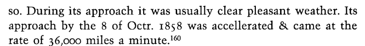 Back in Indianapolis Fletcher continued to observe the comet, noting that it began to recede by the middle of October. The last time Fletcher saw the comet was on the 17th, where he proclaimed that “it was one of the grandest spectecles[sic] I ever witnessed in the heavens. Its tail as called extended from the neuclious[sic] down in the horizon an hour high of the way up. Its blaze seemed when coming towards us like the blaze that follows a swift runing[sic] locomotive when the smoke ascends directly up with a gentle curve.”