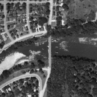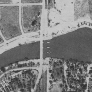 When the line was abandoned in the late 1930s, the bridge was removed, although the bridge piers and abutments remained for another 25 years. Aerial images still showed the piers and abutments for the bridge. Only three piers are visible in these photos. I believe that the remaining two piers (shown in the image above) may be lost in the shoreline on the northside of the river. The images below are from 1937, shortly after the demise of the line, 1962, and when the present-day College Avenue bridge was being built in 1966. As of this final photo, the piers and abutments are no longer visible.